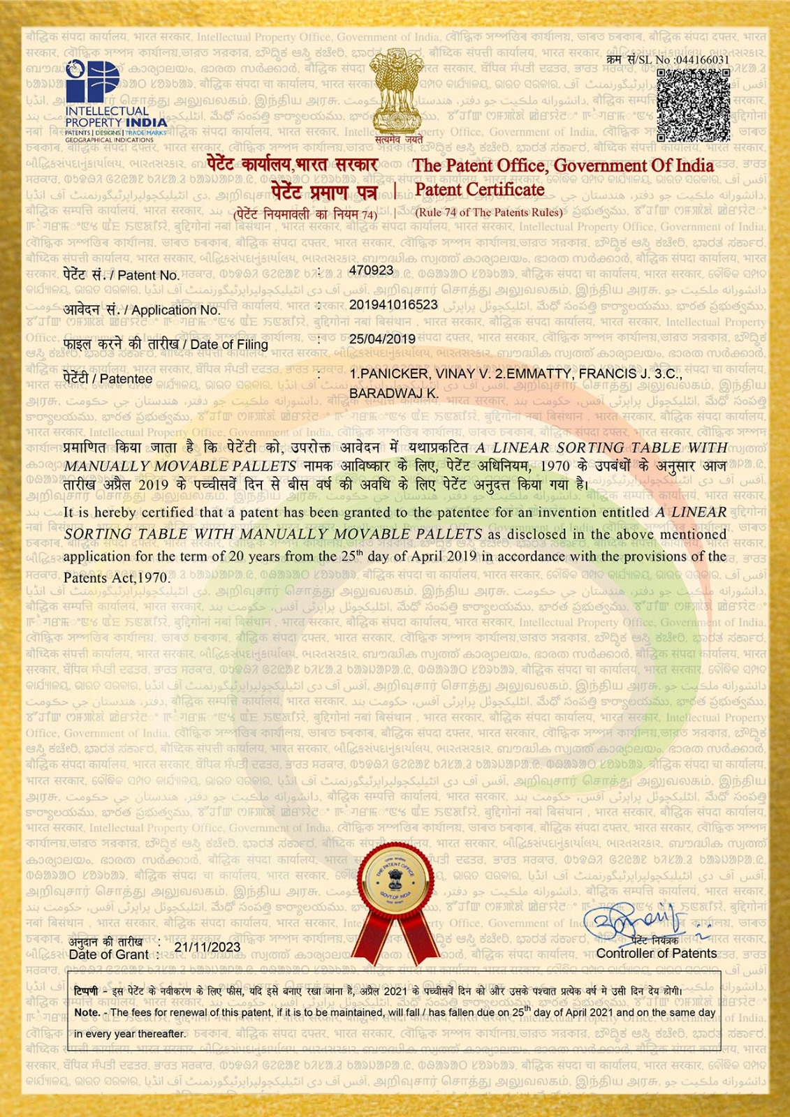 Title: A LINEAR SORTING TABLE WITH MANUALLY MOVABLE PALLETS